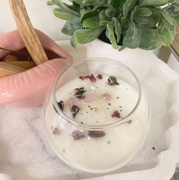 Fall in love with this magical crystal ball shaped candle topped with rose quartz, rose buds and glitter.