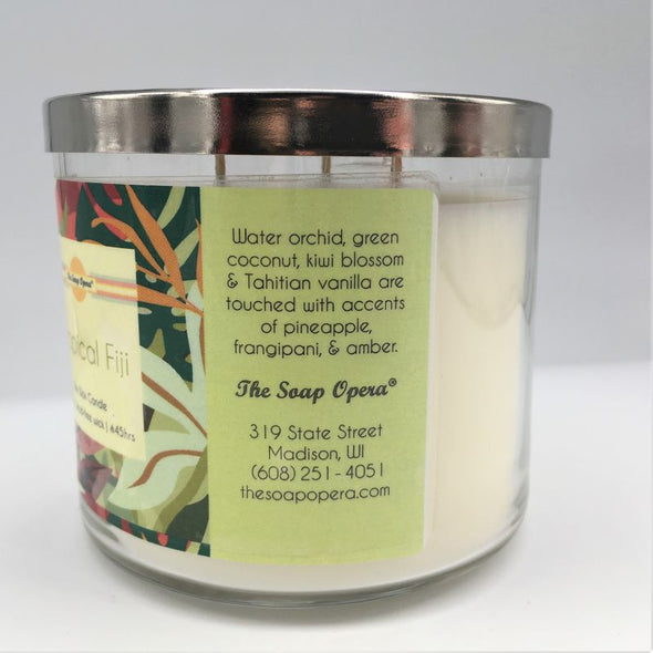 Tropical Fiji is a juicy and sweet blend of water orchid, green coconut, kiwi blossom, & Tahitian vanilla touched with accents of pineapple, frangipani, & amber. The Soap Opera's collection of 100% soy wax candles are highly fragrant and burn clean for at least 45 hours. Lovingly crafted with lead-free wicks in the USA, these candles provide non-toxic room fragrance for the whole family to enjoy.