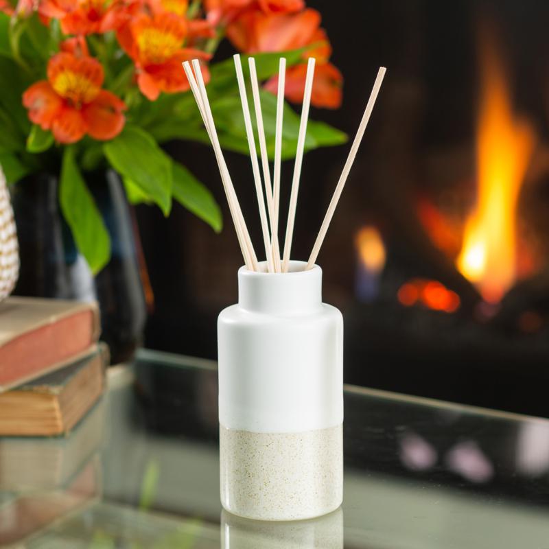 The Vanilla Citrus Reed Diffuser features fresh fruits and citrus blended with smooth, soft, vanilla. This easy-to-use fragrance diffuser lets you set it and forget it! The fragrance is made with essential oils and lasts approximately 8 weeks. Bring the perfect amount of fresh to any room or space. Includes a stylish sandy cream ceramic vase and vanilla citrus fragrance oil.