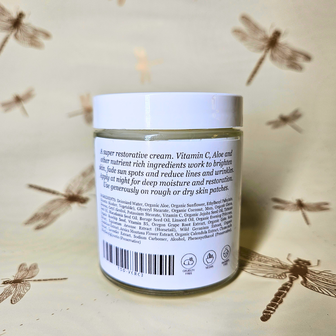 This is a super restorative cream for face and body. Vitamin C, Aloe and other nutrient rich ingredients work to brighten skin, fade sun spots and reduce lines and wrinkles. Apply at night for deep moisture and restoration. Use generously on rough or dry skin patches.