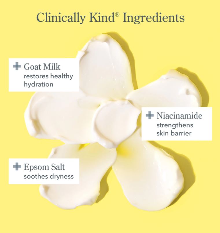 Ingredients: Water (Aqua), Coconut Alkanes, Coco-Caprylate, Propanediol, Magnesium Sulfate, Polyglyceryl-4 Diisostearate/Polyhydroxystearate/Sebacate, Caprae Lac (Goat Milk), Colostrum, Bifida Ferment Lysate, Lactose, Milk Protein, Aloe Barbadensis Leaf Extract, Honey, Eryngium Alpinum (Blue Thistle) Flower Extract, Cucumis Sativus (Cucumber) Fruit Extract, Chamomilla Recutita (Matricaria) Flower Extract, Symphytum Officinale (Comfrey) Leaf Extract, Helianthus Annuus (Sunflower) Seed Oil, Niacinamide, Whey Protein, Gluconolactone, Caprylic/Capric Triglyceride, Coco-Caprylate/Caprate, Polyglyceryl-3 Oleate, Diisostearoyl Polyglyceryl-3 Dimer Dilinoleate, Zinc Stearate, Glycerin, Sodium Benzoate, Calcium Gluconate, Tocopherol, C10-18 Triglycerides, Lecithin … and Kindness.