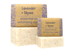 Get soft, glowing skin with a natural exfoliating bar soap fragranced with an herbaceous Lavender and Thyme scent. Enriched with cocoa butter, shea, and grapeseed oil to cleanse skin without stripping it of its natural moisture. Oatmeal, thyme leaf, and lavender bud provide gentle exfoliation to promote circulation and remove dead skin cells. The pure essential oils provide a relaxing aromatherapy experience. Wrapped in recycled paper printed with soy-based ink