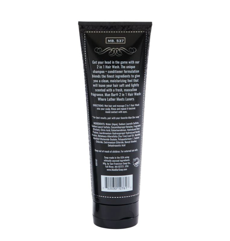 Get your head in the game with our 2-in-1 Hair Wash. The unique shampoo + conditioner formulation blends the finest ingredients to give you a clean, moisturizing feel that will leave your hair soft and lightly scented with a fresh, masculine fragrance. Man Bar 2-in-1 Hair Wash – Where Lather Meets Luxury.