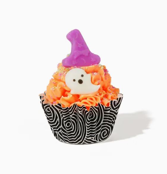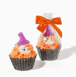 Not a trick, but a treat! This soap cupcake features a vibrant orange frosting and is topped with a witch's hat and ghost for the perfect Halloween gift or decoration.