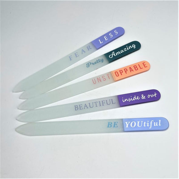 Grace your nails with these uplifting quote glass nail files. Comes in five fun styles. Made from glass for durability and long-lasting usage. Comes in a plastic sleeve for storage. Perfect for gifting!