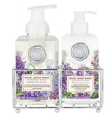 The Michel Design Works French Lilacs Handcare Caddy comes with their popular French Lilacs Foaming Hand Soap, Lemon Basil Hand and Body Lotion, and a beautiful silver-toned caddy to hold them. Perfect for use in the bathroom or kitchen, this elegant and convenient set is sure to impress.
