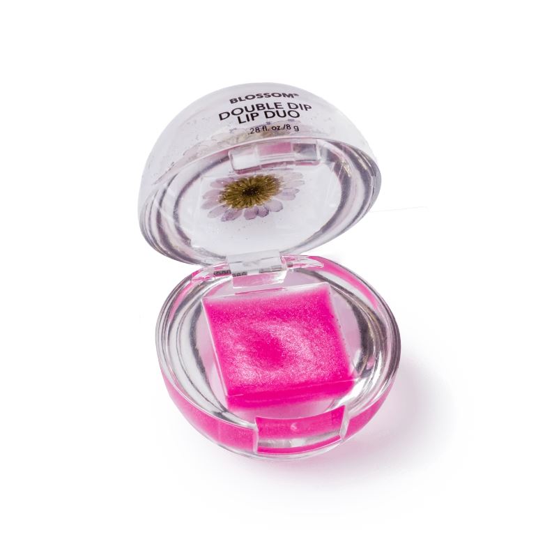 Keep your lips looking picture perfect with the Blossom Duo Red Lip Gloss! Each round compact case is centered with a real flower and opens to reveal two shades – one clear lip gloss and one red glitter gloss. Blended with natural ingredients and mineral oil to keep your lips super-soft and looking good!