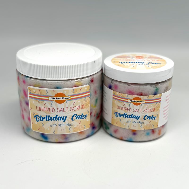 Celebrate with our signature Birthday Cake scent and sprinkles! Exfoliate away dead skin cells that can make the skin look dull, rough and dry. The Soap Opera's Sugar or Salt Scrub is made with amazing moisturizing ingredients, whipped together with The Soap Opera's pure fragrance oils and herbs! This unique product is a triple threat as a cleanser, scrub and moisturizer all in one convenient package. The thick creamy lather rinses cleanly away revealing softer, velvety smooth skin. Mild enough for everyday use.