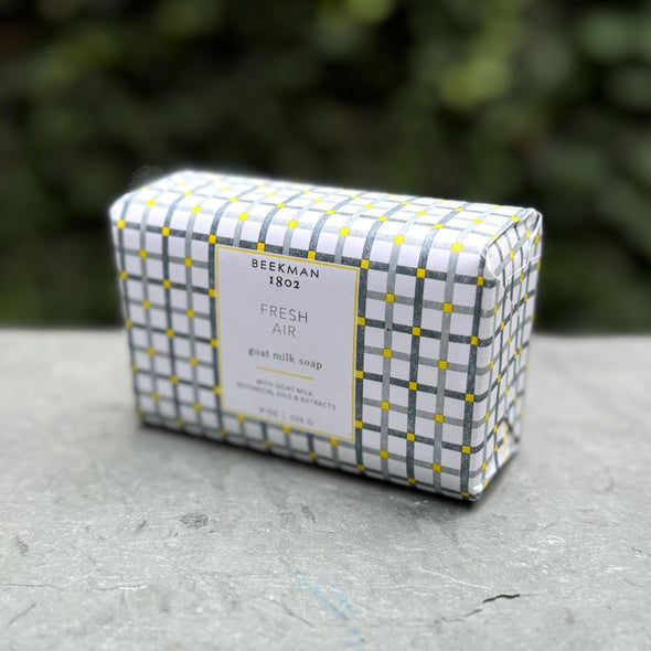 Beekman 1802’s Fresh Air Goat Milk Soap is scented with subtle notes of green citrus and spring leaves. Enriched with nourishing shea butter and bright verbena leaf, this fresh air formula balances and soothes skin while keeping you relaxed and smelling fresh. Beekman's bar soaps are triple milled, a process which squeezes out excess moisture to create soap that is longer lasting and more pure than other bar soaps. The lactic acid in goat milk makes it a natural exfoliant. Features botanical based ingredients from farms rather than labs. Sulfate, Paraben, Petroleum & Phosphate Free. Clean and Simple.