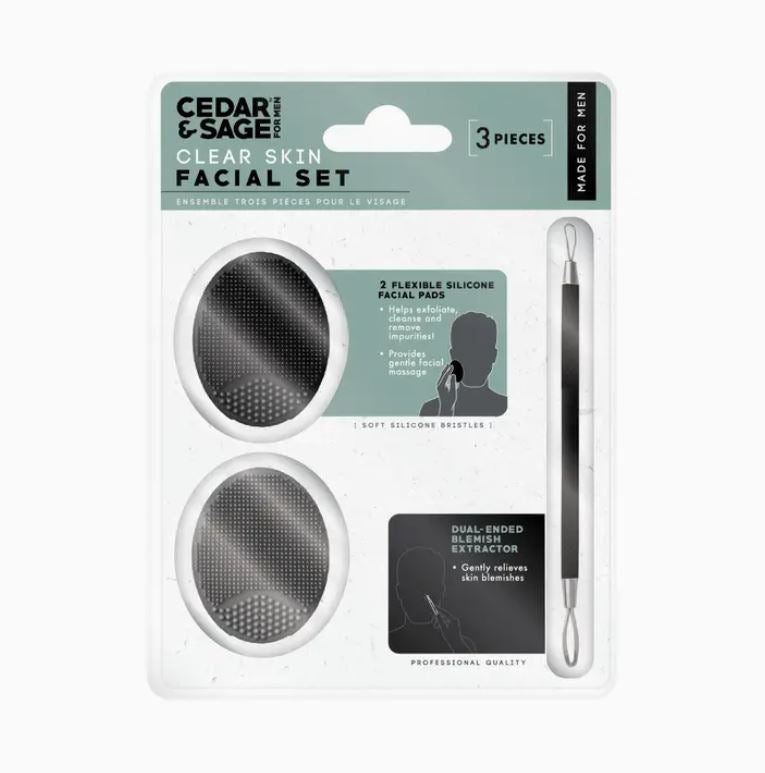 The Cedar & Sage Clear Skin Facial Set of 3 for Men includes a facial pad with soft, flexible bristles that effectively remove dead skin cells and impurities over time. Made of silicone, the pad is durable yet gentle, making it suitable for daily use in your skincare routine. Additionally, the dual-ended blemish extractor is a versatile tool for targeting stubborn blemishes and promoting clearer skin.