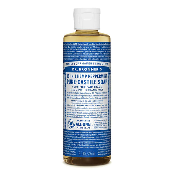 1 soap for 18 different uses! Dr. Bronner’s Pure-Castile Liquid Soap is Certified Fair Trade and made with Organic Oils to be one of the mildest, most pleasant soaps you have ever used. Guaranteed no synthetic oils and 100% vegetarian. Dr. Bronner’s Pure-Castile Liquid Soap has outstanding water softening and cleansing powers, working to dissolve dirt rather than to cut through it. Find your favorite use for Dr. Bronner’s Pure-Castile Liquid Soap today and fall in love with this simple yet highly effective answer to all your daily needs.