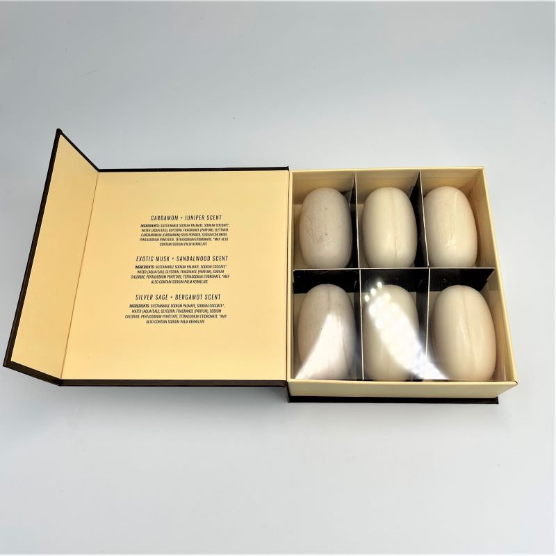 - Comes with 6 bar soaps including 2 each of: Cardamom & Juniper, Exotic Musk & Sandalwood, and Silver Sage & Bergamot.